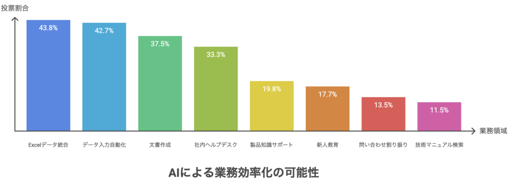 これらの結果から、多くの企業が日常的なデータ作業や書類作成に“隠れた時間泥棒”がいると感じており、そこからAI活用を始めたいと考えていることが分かります。